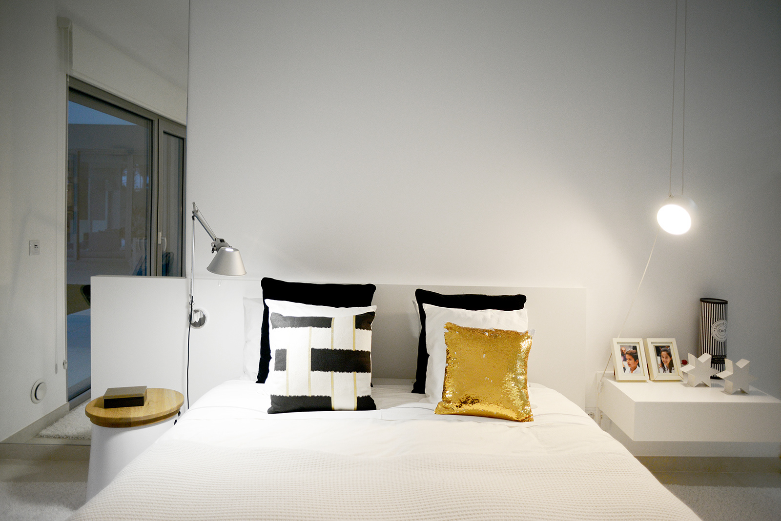 Bedrooms in Aroeira House followed the same design principles as the rest of the space: modern hotel ambience, confortable and with only essential pieces. We have the bed, side tables and great lighting. Wallpapers are great to decor and bring coziness to the spaces.