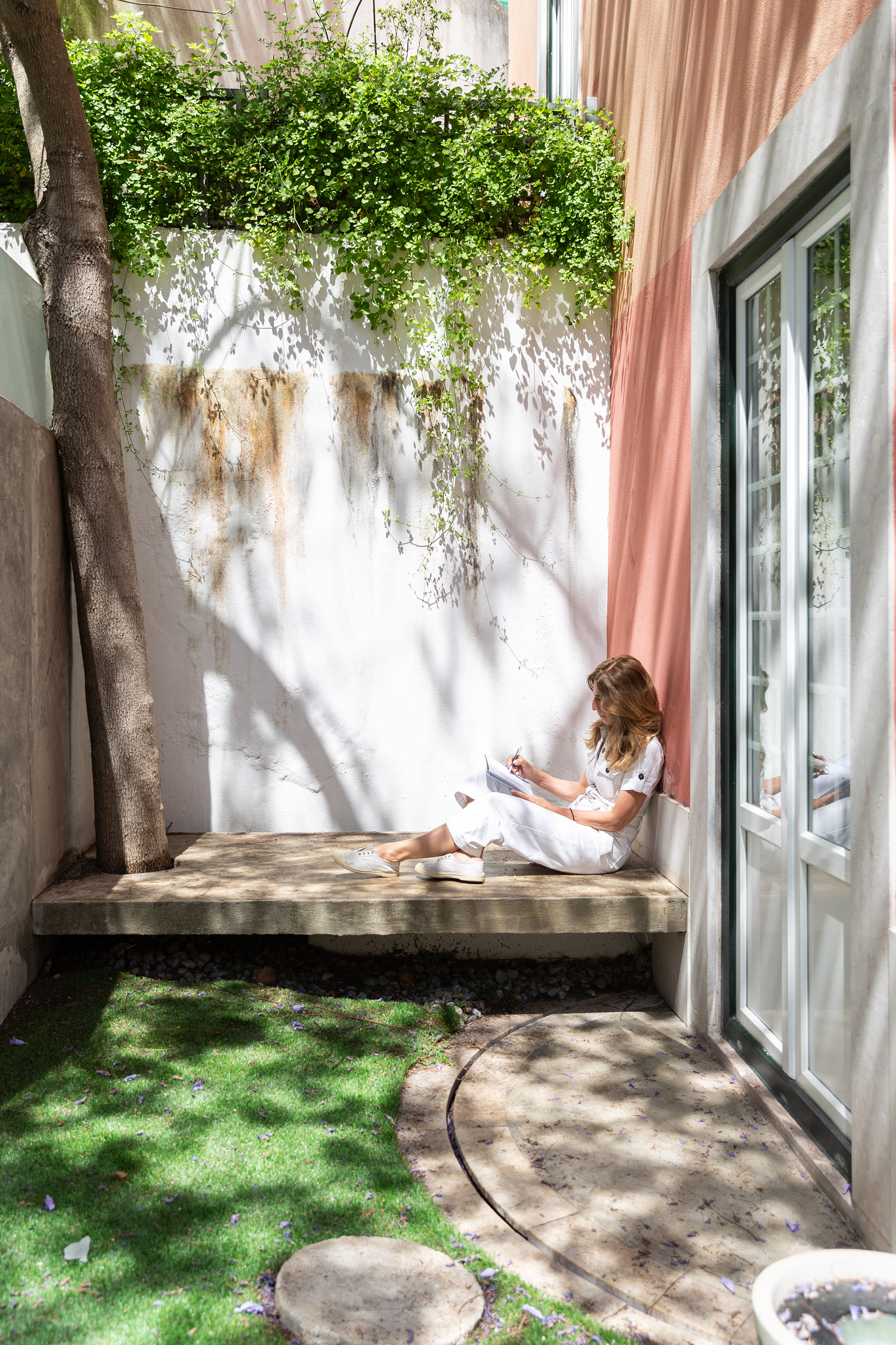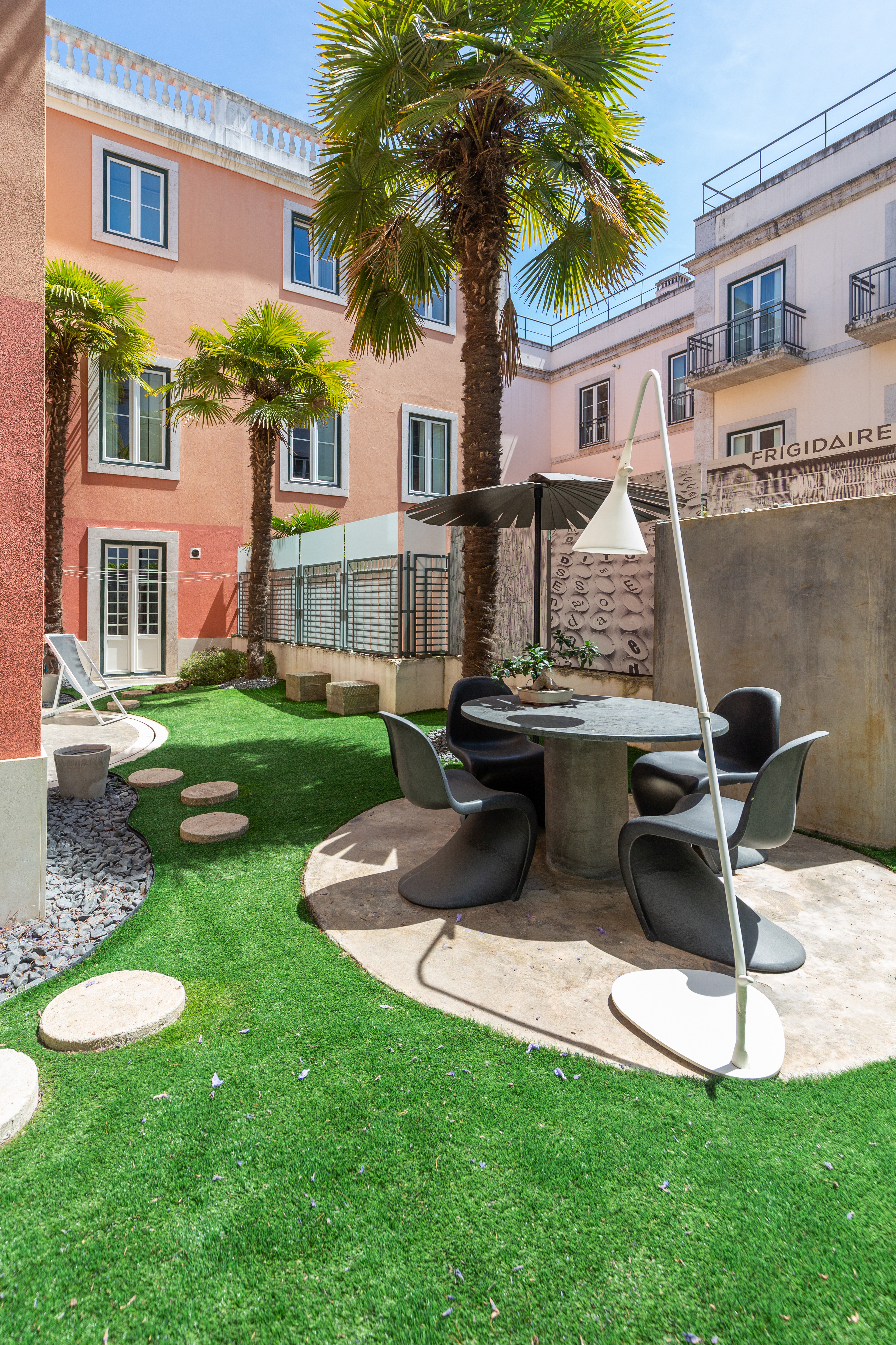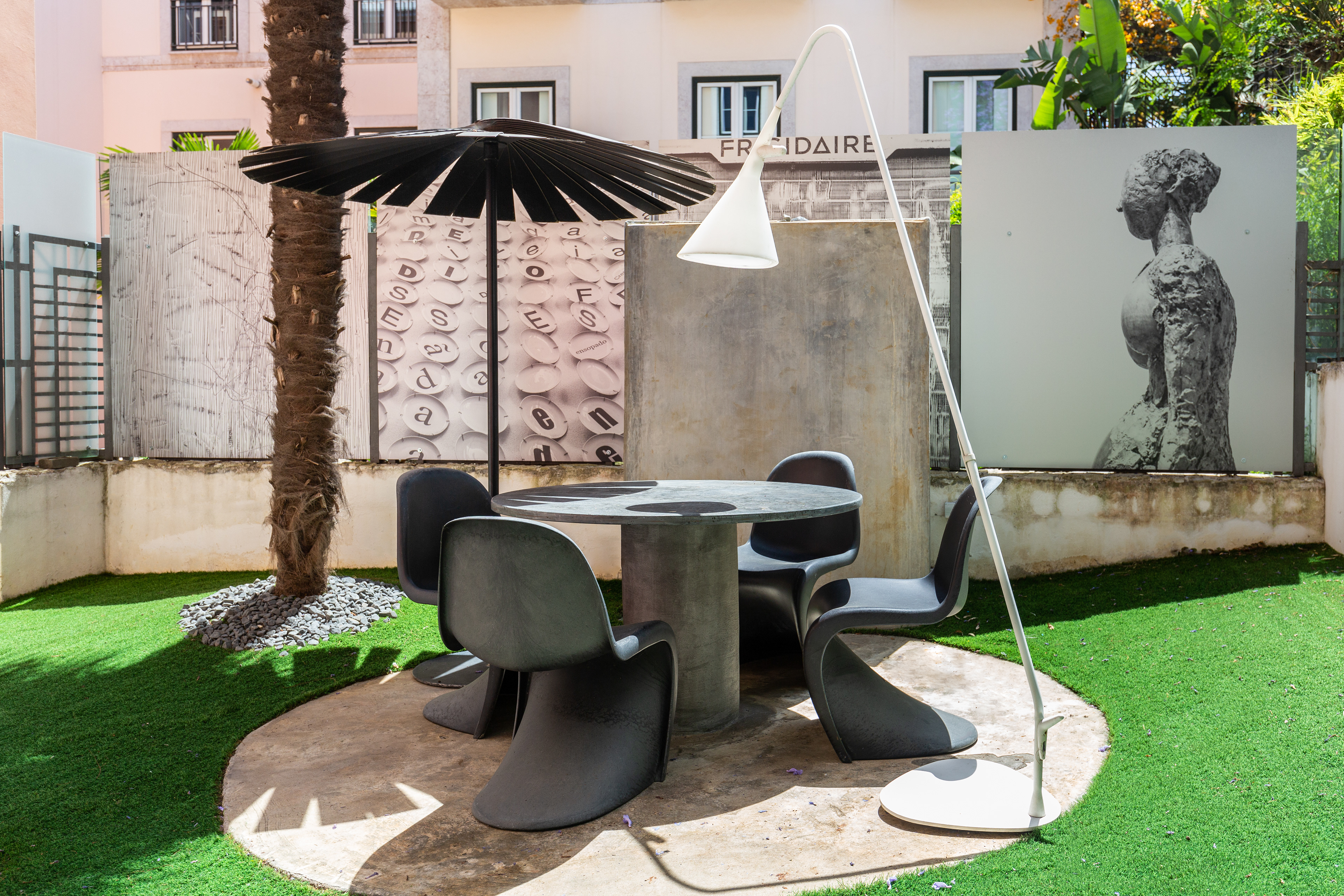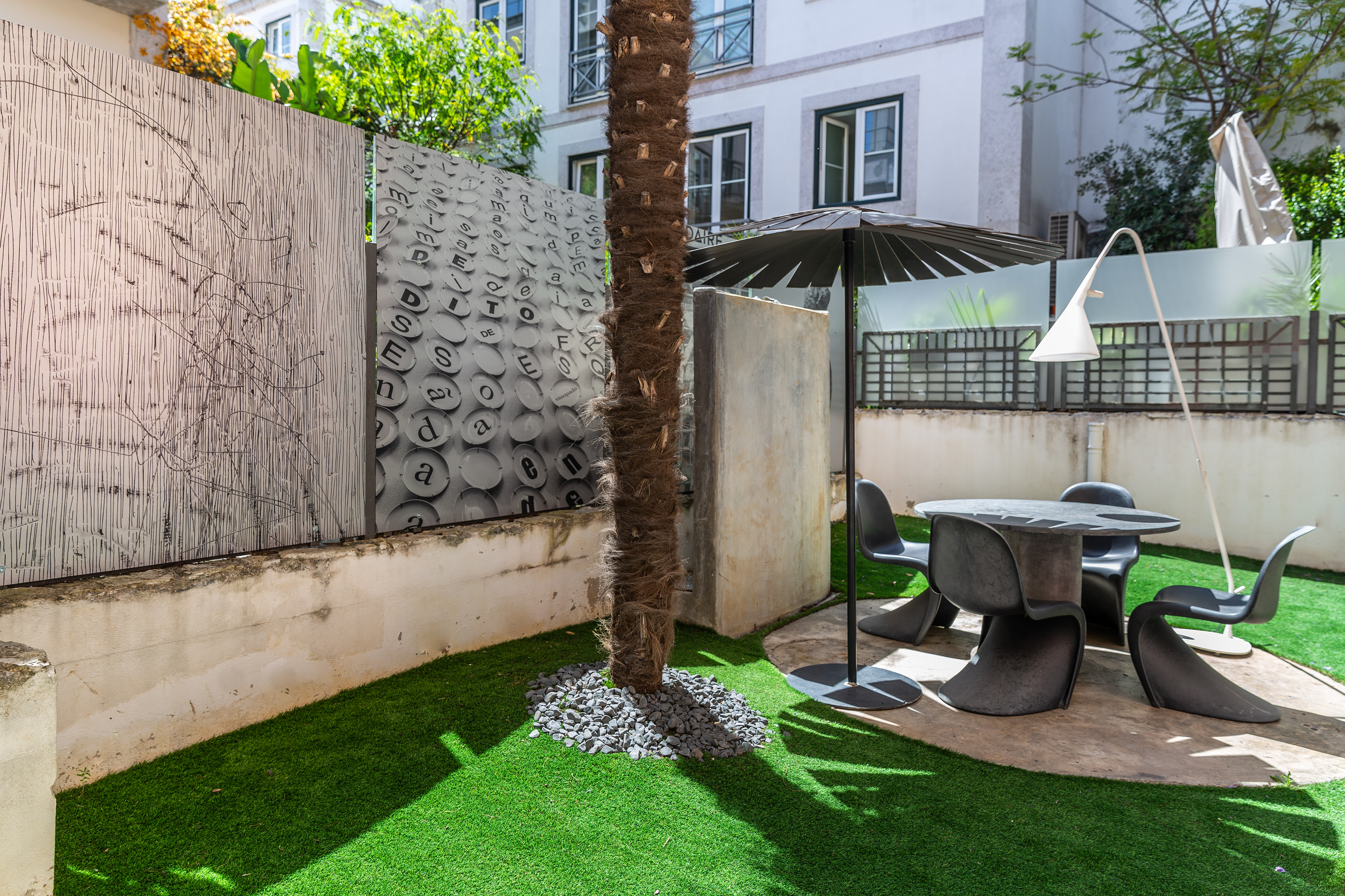 I was asked to organize an outdoor space for an apartment on the ground floor and transform it into a small garden, with a dining and living space integrated. I designed some concrete pieces, such as the table and a bench, matching the floor tiles material, to be resistant and easy to maintain.